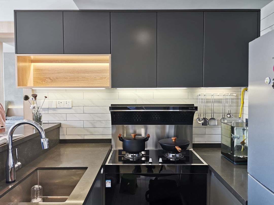 小戶型廚房,設計為開放廚房,視野更開闊,集成灶可以提高排油煙的效率。
