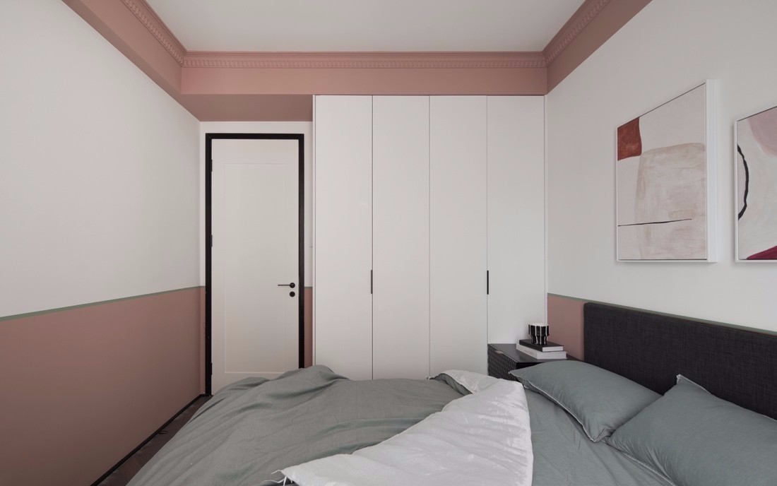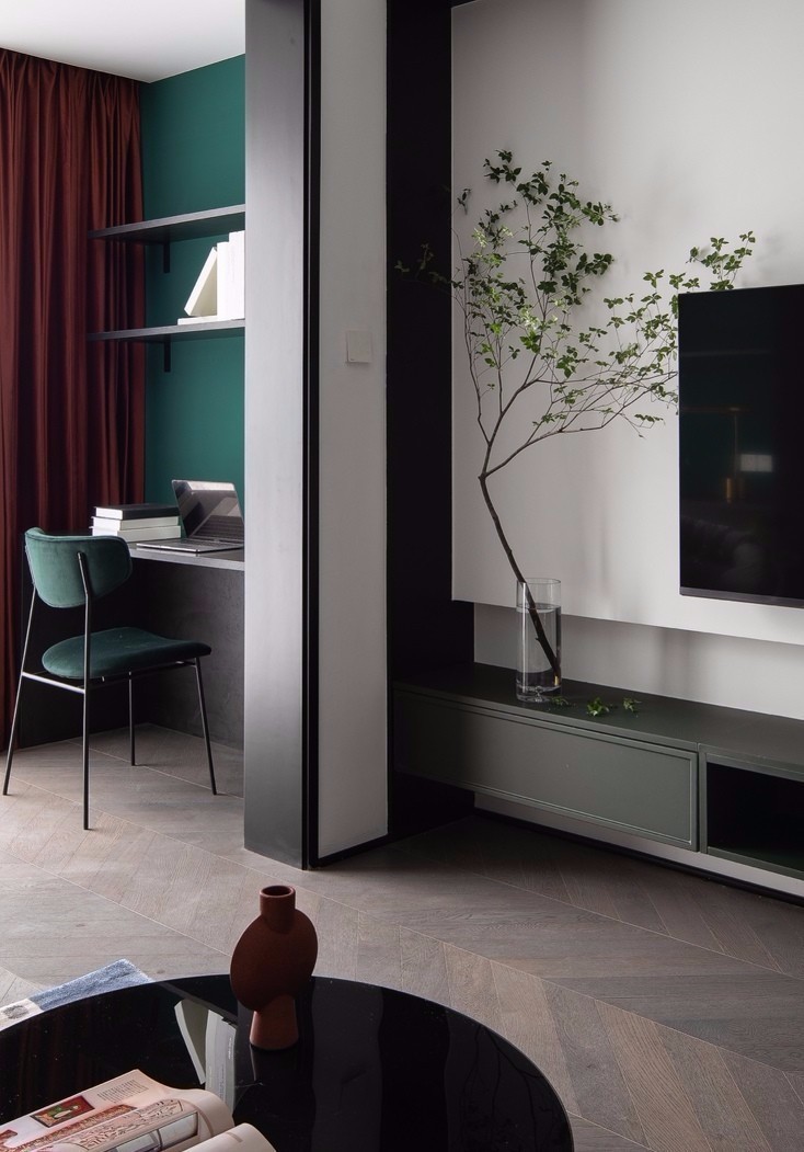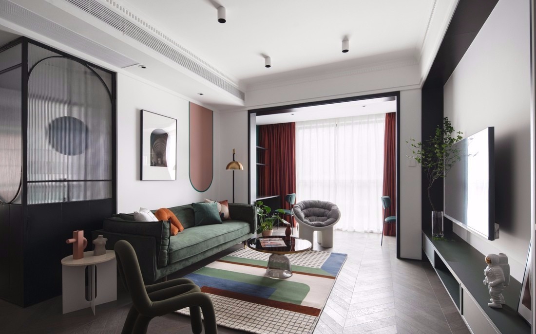 客廳空間以白色為主色調,融入墨綠、酒紅、臟粉等低飽和度彩色,為空間增添了繽紛、動感的視覺效果。